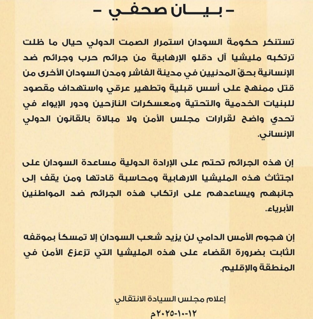 جاء ذلك في بيان صادر عن إعلام مجلس السيادة الانتقالي، حمل عنوان “تحدي واضح لقرارات مجلس الأمن”، واتهم المليشيا بارتكاب “جرائم حرب وجرائم ضد الإنسانية” تشمل “قتلًا ممنهجًا على أسس قبلية وتطهيرًا عرقيًا”.